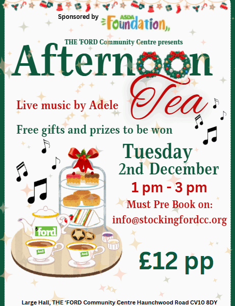 'The FORD' Community Centre are holding an Afternoon Tea with live music by Adele. There will be free gifts and prizes to win. Pre booking is essential - menu available on request