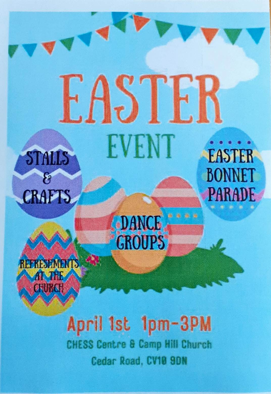 The CHESS Centre and Camp Hill Church are running an special Easter Event at both the CHESS Centre and Camp Hill Church in Cedar Road, Camp Hill, Nuneaton, CV10 9DN on Wednesday 1st April 2026. There will be an Easter Bonnet Competition,Dance Displays, Stalls, Crafts and Refreshments. If you would like a stall, please contact colleagues at the CHESS Centre via chesscentre@warwickshire.gov.uk